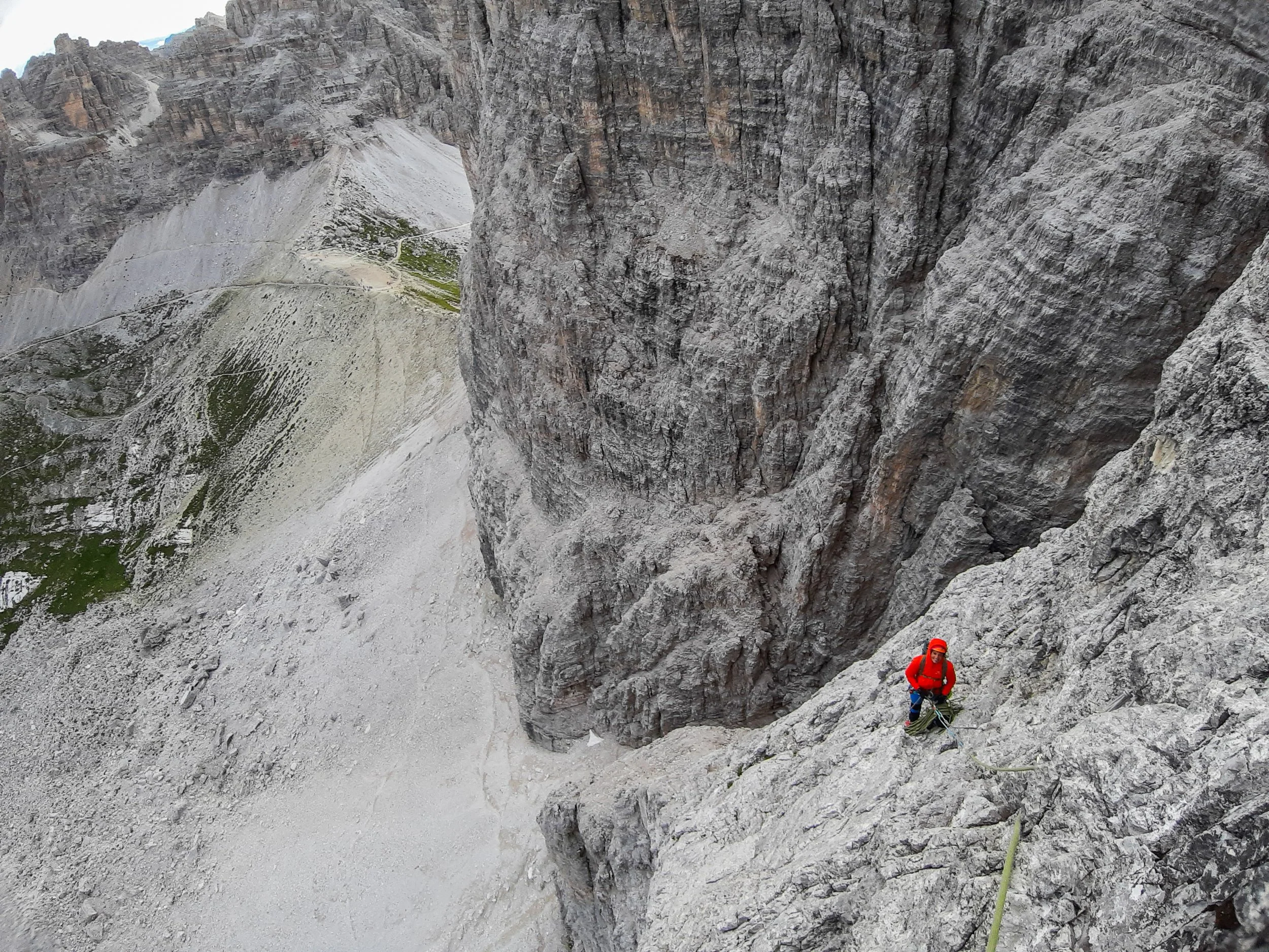 Eine ausgesetzte, leicht überhängende Kletterei durch die Nordwand der Großen Zinne mit atemberaubenden Tiefblick.