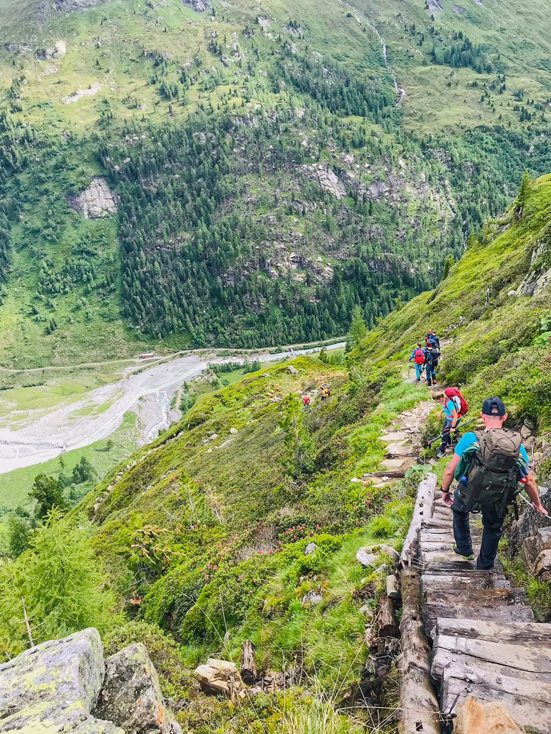 Vom Parkplatz beim Matreier Tauernhaus (1512 m) geht es um ca. 09.00 Uhr mit dem Taxi nach Innergschlöss zum Venedigerhaus (1691 m). Von dort auf einem markierten Wanderweg vorbei an der Alten Pragerhütte zur Neuen Pragerhütte (2796 m) in ca. 2,5 h. Wenn die Kondition und das Wetter passen, geht es nach einer ausgiebigen Pause bei der Hütte weiter Richtung Gipfel. Zuerst noch über felsiges Gelände kommen wir dann auf einer Höhe von ca. 3000 m zum Gletscher, wo wir dann die Steigeisen anlegen. Nun geht es unschwierieg aber in einer imposanten Gletscher- und Spaltenlandschaft über einem ausgesetzten Gipfelgrat zum Gipfel des Großvenediger (3660 m). Für diese ca. 860 Hm werden ca. 3,5 h benötigt. Alternativ können wir am nächsten Morgen nach dem Frühstück starten. Der Abstieg erfolgt über die gleiche Route wie der Aufstieg, ca. 2 h zur Neuen Pragerhütte und weitere 1,5 h zum Parkplatz beim Venedigerhaus, wo wir dann wieder mit dem Taxi zurück zum Matreier Tauernhaus fahren.